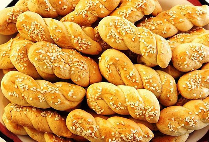 Из вышеуказанных ингредиентов приготовить однородную массу (тесто). Из теста скатать маленькие жгуты, толщиной приблизительно по 1 см, и из них сделать косички по 6 см. Выложить печенье на противень, смазанный маслом, каждое печенье смазать яйцом. Выпекать при температуре 175 ο С 20 минут до появления золотистой корочки. Из вышеуказанных ингредиентов можно испечь 2 противня печений.