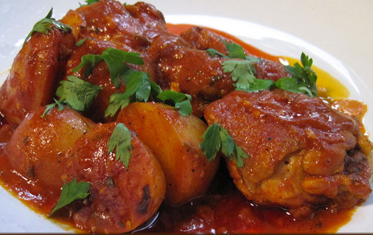 Обвалять порционные куски курицы в муке, налить масло в кастрюлю, подогреть, добавить куриное мясо, слегка его обжарить и затем продолжать тушить. Выложить в дуршлаг, чтобы стекло масло. Пассировать лук, добавить помидоры, чеснок, лавровый лист, сахар, соль, перец и немного воды. В полученную массу добавить куски курицы. Тушить 45 минут. При необходимости добавить воды.