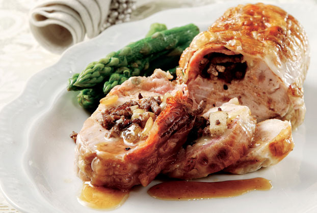 Кусочки курицы завернуть в бекон. Рулеты закрепить зубочистками. Жарить их в масле на сковороде, затем откинуть на дуршлаг, чтобы стекло масло, добавить вино. Муку развести водой и добавить в вино. Чуть вскипятить, поперчить, посолить, положить куриные рулеты на сковороду и минут 10 тушить при закрытой крышке. Посыпать сыром.