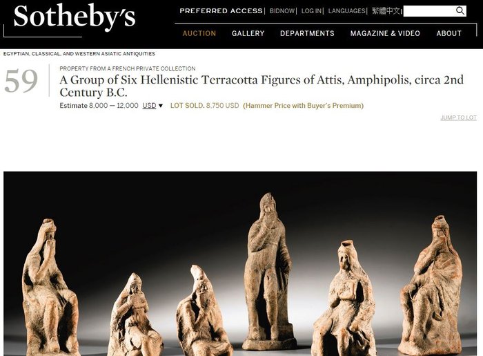 бога Аттиса проданы за 8,750долларов на аукционе дома Sotheby's, который пустил их с «молотка» с указанием места происхождения - Амфиполис.