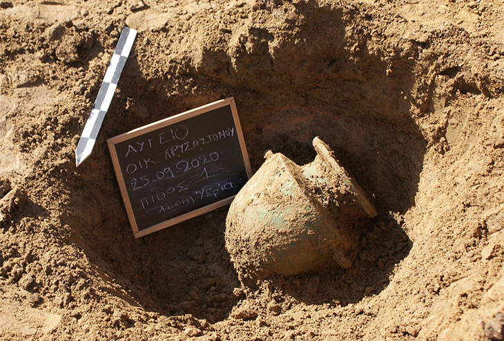 Внутри одного из питхоев, которые были настолько большими, что их часто использовали в качестве гробов, археологи обнаружили богато украшенную бронзовую урну с основанием.