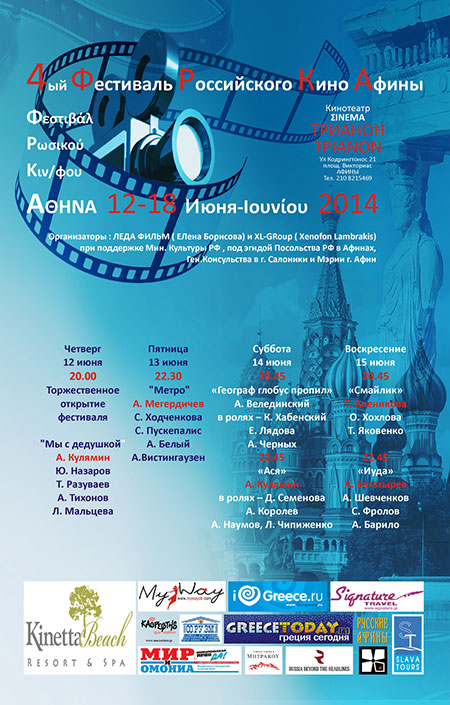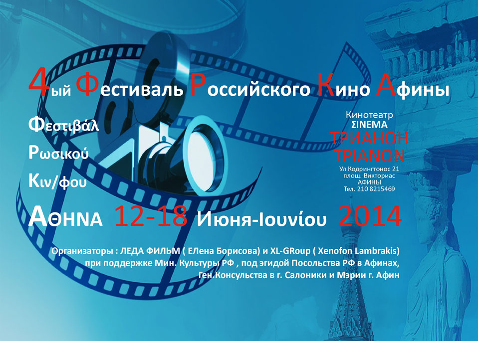 «Кинокомпания «ЛЕДА-ФИЛЬМ» /Elena Borisova/ и «XL-Group» /Xenofon Lambrakis/ при поддержке Министерства культуры РФ проводит в Афинах «4-ый Фестиваль российских фильмов в Греции».