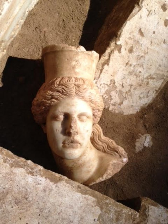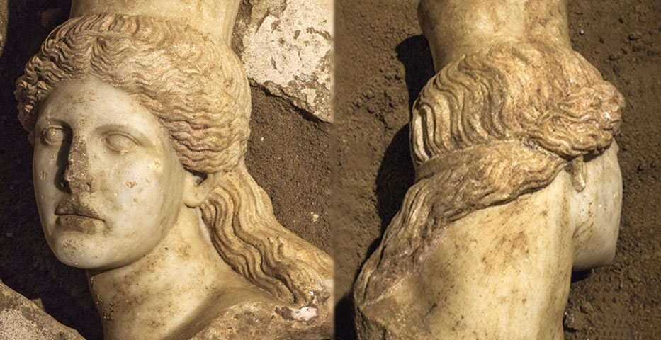 Голова имеет волнистые кудри со следами красной краски, которые спадают на левое плечо и перевязаны тонкой ленточкой. Также обнаружены фрагменты крыльев сфинксов.