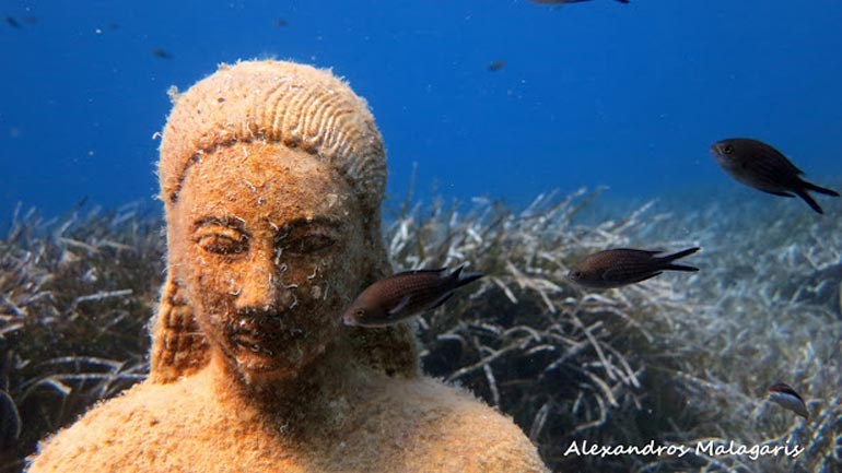 Курос стал частью морского дна: на его пористой поверхности прижились морские организмы, вокруг плавают
