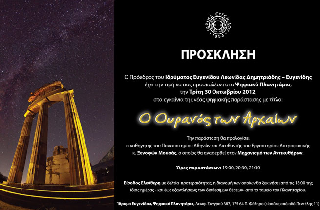 Серия новых фильмов начинается демонстрироваться в Цифровом Планетарии Афин с 30 октября под общим названием «Каким видели небо древние», начиная с древних египтян.
