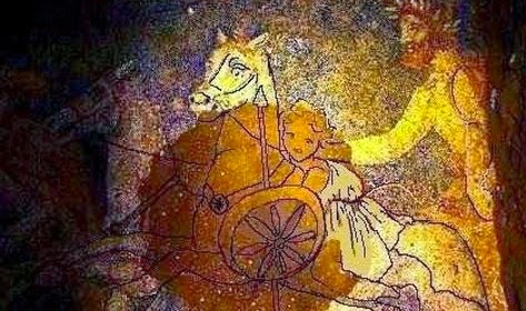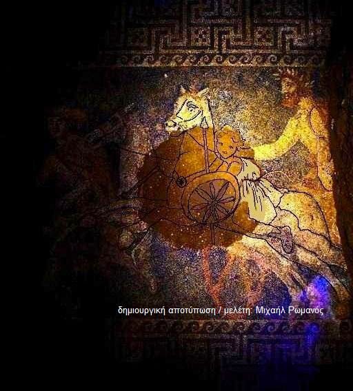 Мозаика представляет, вероятно, похищение Персефоны Плутоном и спуск в Аид... Любимый сюжет греческой мифологии, который подходит для отделки погребальных памятников того времени. Но так ли это? Хотел ли художник раскрыть только эту тему или предоставить информацию о личности умершего или погибшего, который находится в этой уникальной гробнице? И если Плутон - король Филипп II, отец великого полководца, Персефона – Олимпиада, его жена... то ребенок – это недостающий элемент семьи и вечного их покоя, их сын... Александр Великий.