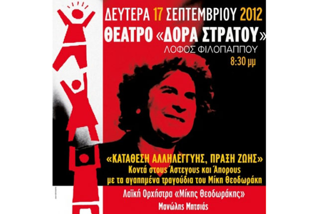 Благотворительный концерт в театре греческого традиционного танца «Дора Страту» организовал оркестр «Микис Теодоракис» в сотрудничестве с Центром Солидарности Афинской мэрии, где вместо билета зрители расплачивались продуктами, которые затем будут распределены среди афинских бездомных и неимущих семей. В концерте – также безвозмездно - приняли участие популярные певцы и актеры: Ставрос Залмас, Манолис Мицьяс, Бесси Мальфа и др. У входа в театр находились работники муниципалитета, которые получали из рук зрителей продукты и упаковывали их в ящики, чтобы уже следующим утром начать выдачу зарегистрированным в муниципалитете бездомным и неимущим.