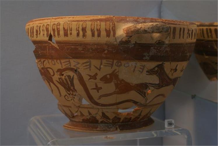 Чаша, которая была найдена недалеко от руин древнего акрополя Алон, примерно в 40 км к северу от Фив, осталась почти целой, отсутствует приблизительно 1/3 сосуда вместе с ручкой. Однако, на остальной поверхности хорошо видно животных: корову, змею, кролика, маленькую собаку, большую собаку, скорпиона, дельфина и в передней части - льва или пантеру.
