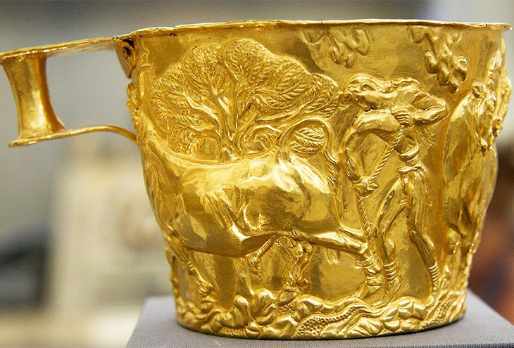 Пара потрясающих золотых чашек, которые называются «чашками Вафейо», считаются шедеврами древнегреческого искусства. Искусно изготовленные золотые предметы были найдены в гробнице Вафейо Толос в Лаконии, Греция, в конце девятнадцатого века.