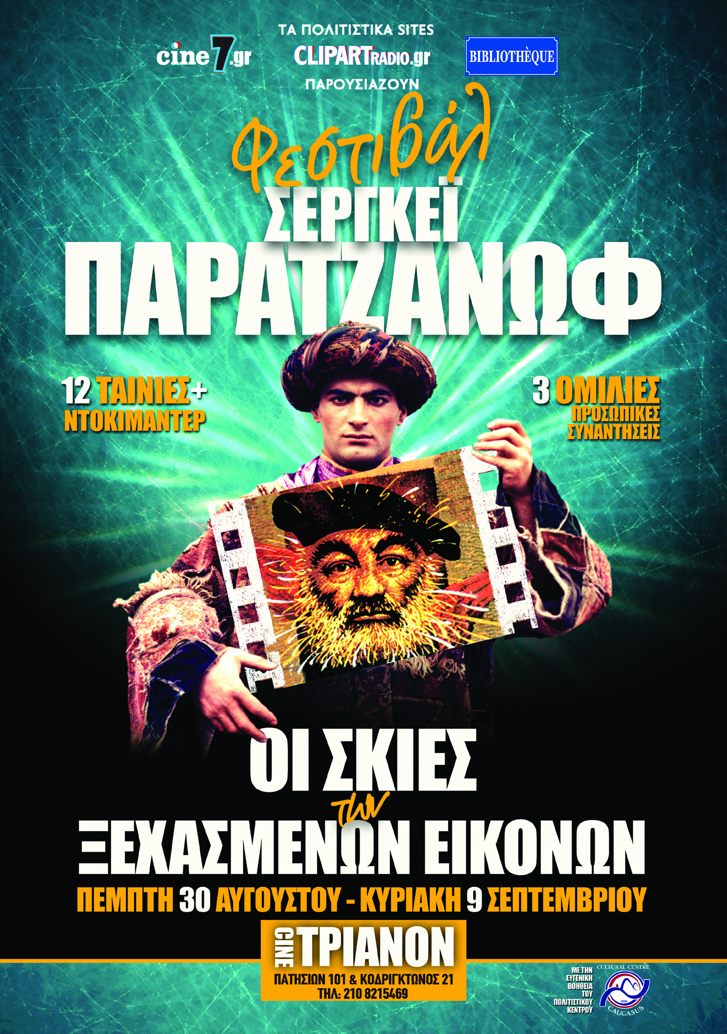 Под таким названием с 30 августа по 9 сентября в Афинах, в кинотеатре ТРИАНОН по адресу ул. Патисион&Кодриктонос 21 пройдет Фестиваль кинофильмов режиссера Сергея Параджанова.