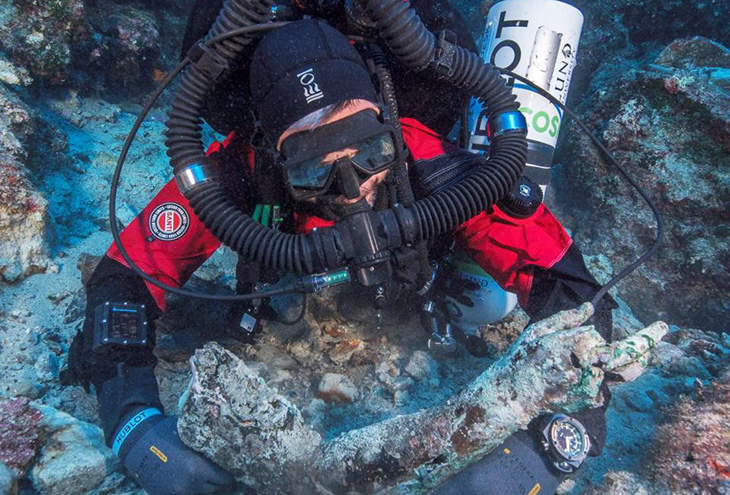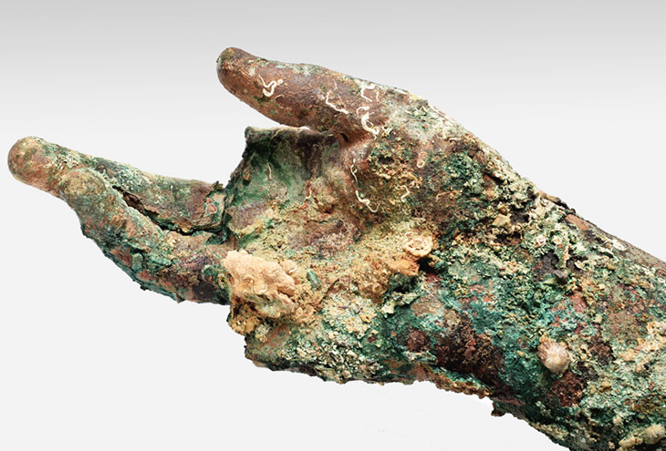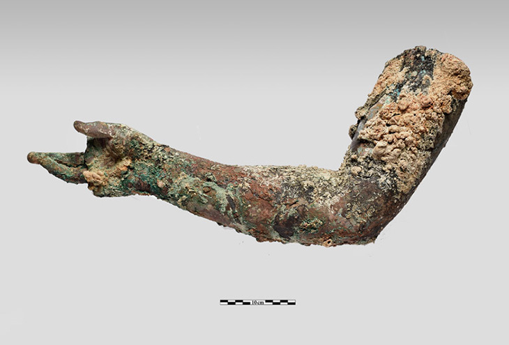 Исследования близ остова затонувшего корабля 1 века до н.э. археологи проводили при помощи подводного металлоискателя, который помимо уже найденной бронзовой руки показал наличие и прочих металлов в большом количестве. Если точнее, то, по заявлению ученых, на дне их покоится порядка нескольких тонн.