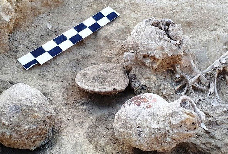 Возможно, самой интригующей находкой в древнегреческом городе была пара эллинистических каменных гробниц, рядом с каждой из которых находилось множество погребальных предметов, в том числе амфоры, винные кувшины или ойнохои, бронзовые тарелки и винные чаши, называемые скифои, а также небольшие золотые и серебряные реликвии.