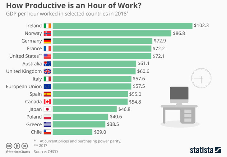 Так, продуктивность одного часа работы греков в плане вклада в ВВП страны была оценена в среднем в 38.5 долларов США. Для сравнения в Ираландии (лидер списка) этот показатель равен 102.3 долларам, что означает, что для обеспечения аналогичной продуктивности грекам следует работать чуть ли не 24 часа в сутки.
