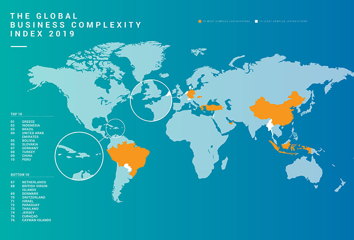 Global Business Complexity Index 2019 (Глобальный индекс сложности бизнеса), которое включило в свой состав аналитику по 76 странам планеты, Греция не только заняла первое место, но и потеряла сразу 17 позиций по сравнению с прошлым годом.