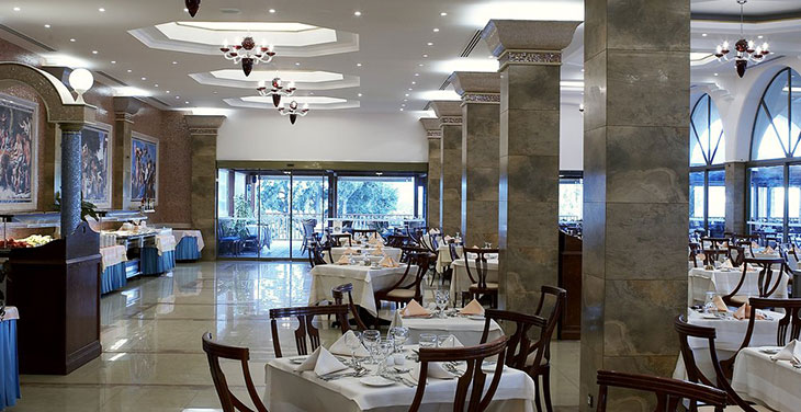 Symposion с обилием угощений по концепции Шведский стол, кулинарным шоу, тематическими вечерами греческой, итальянской, мексиканской, китайской и интернациональной кухни; возможность позднего завтрака в ресторане у бассейна;