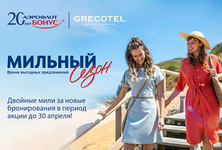 Grecotel приглашает гостей своих отелей отпраздновать юбилей 20тилетия программы «Аэрофлот Бонус» и предлагает двойное начисление миль по акции Мильный сезон! Двойные мили за новые бронирования в период акции до 30 апреля!