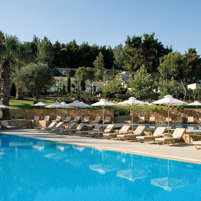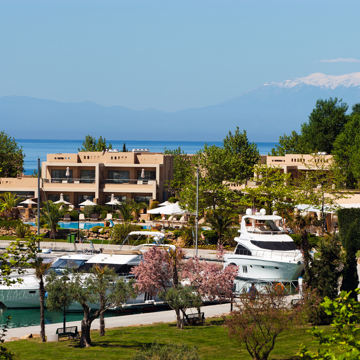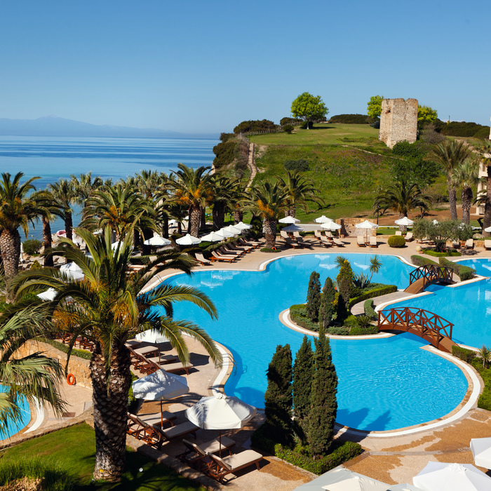 потрясающие виды на Эгейское море, бухту Sani или пышные сады.