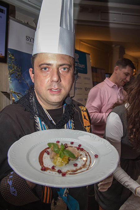 Журналисты, коллеги и друзья, собирались с опозданием, стараясь превозмочь московский коллапс с траффиком. Доехали, дошли, добрались. Волнение, конечно, было – партнер Aldemar в Москве – Префектура Крита. Но как только отзвучали первые речи, и на сцене появился блистательный Петрос – Шеф-повар отеля Knossos Royal (О. Крит), спало напряжение, и, подвязывая фартуки, и одевая колпаки, наши друзья потянулась к месту, где виртуозно двигался Петрос, что-то помешивая, раскладывая и при этом шутя и, успевая позировать на фотоаппараты.