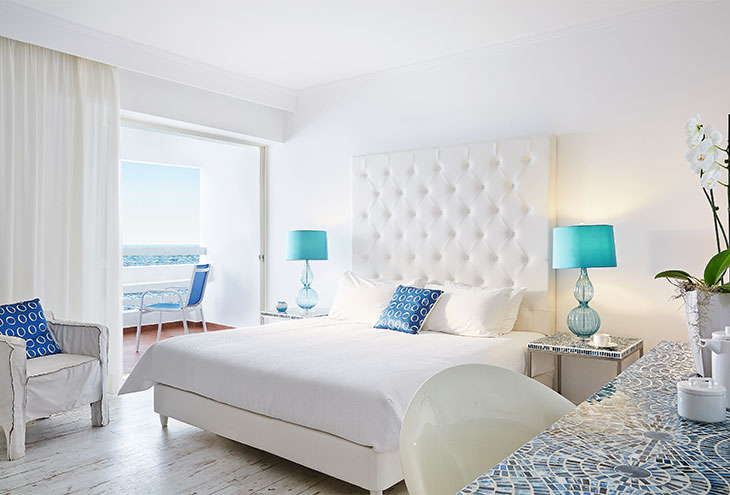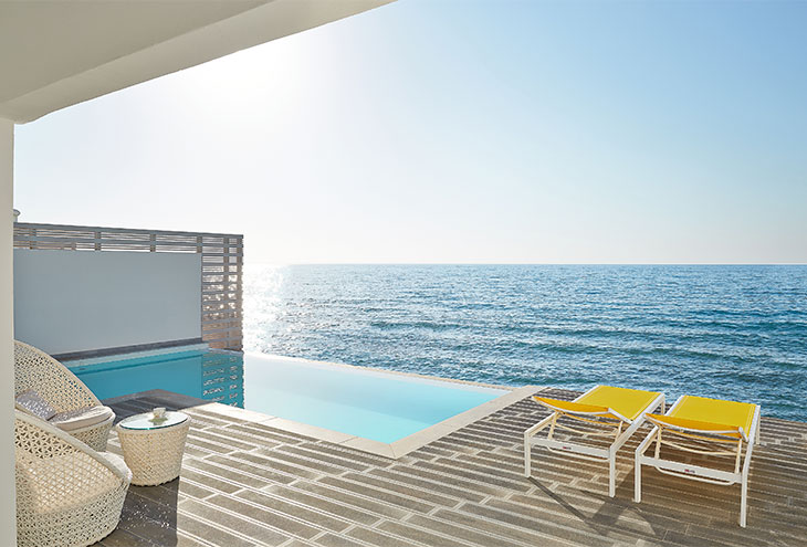 Роскошные сьюты и виллы на берегу моря, воплощение греческого стиля жизни: элегантный дизайн, персональный бассейн, завораживающий вид на море и шум волн.