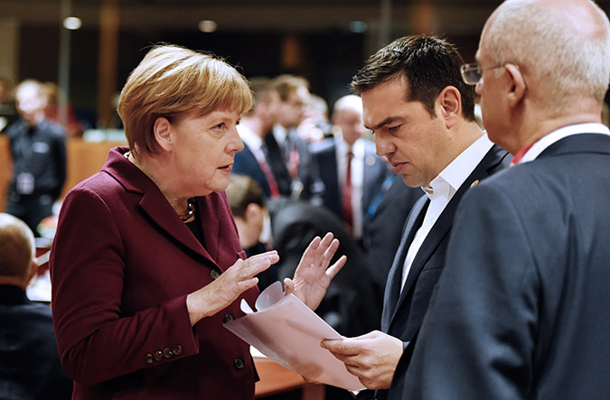Ципрас несколько минут разговаривал с Ангелой Меркель, которая появилась, чтобы обсудить проект текста итогов сессии.