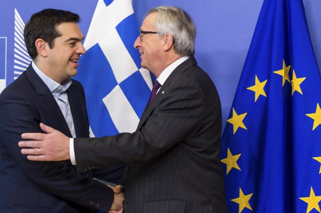 По-старинке, Жан-Клод Юнкер приветствовал Ципраса объятиями, смехом и... сладким похлопыванием по лицу.