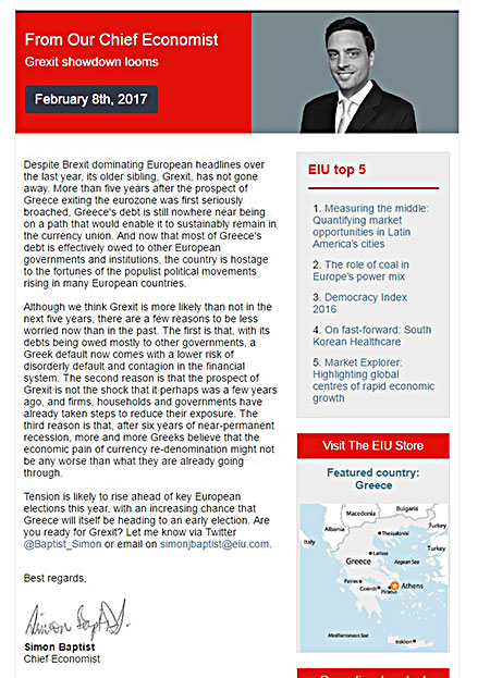 Ведущий специалист EIU Саймон Баптист поделился на днях своим экспертным взглядом на дальнейшие отношения Греция-ЕС. В статье под названием «Grexit showdown looms» (Выход Греции из ЕС маячит на горизонте). Баптист уверяет, что впервые за последние 5 лет вероятность «размолвки» Греции с Европейским Союзом высока как никогда.