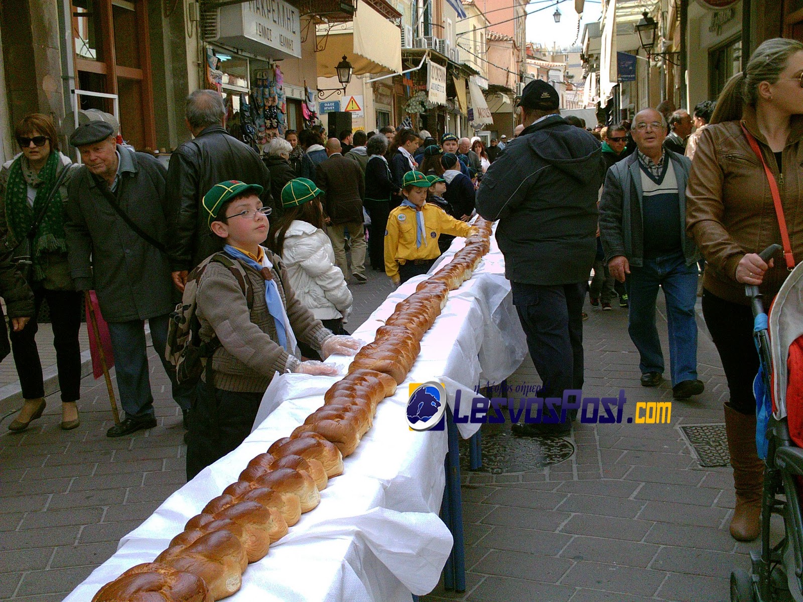 Своеобразно готовятся к пасхе жители острова Лесбоса (Митилини). Точнее – к побитию своего же собственного рекорда: в 2005 году кондитер острова В. Пандазис испек 50-метровый кулич, войдя благодаря своему искусству в книгу рекордов Гиннеса. В этом году гигантский кулич должен удлиниться на целых...20 метров!