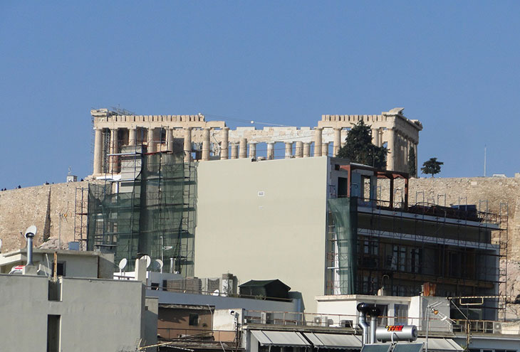 Не так давно в непосредственной близости от Акрополя на перекрестке улиц Фалиру и Мисаралиоту был дан старт строительству двух высотных (по афинским меркам) зданий. В соответствии с планом проекта одно из них строений должно было состоять из 10 этажей, мешая афинянам и гостям города любоваться величественными видами Парфенона.