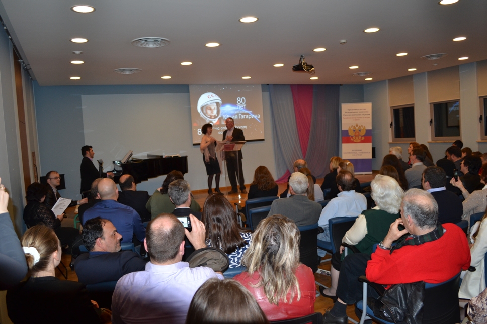 Вечер открыл руководитель Представительства Россотрудничества в Греции Петр Куприков, отметив решающую роль полёта Ю.Гагарина в космос не только для России, но и для всего человечества. С греческой стороны участников торжественного вечера приветствовал заместитель руководителя департамента по вопросам культурного сотрудничества МИД Греции Никос Кайменакис, подчеркнувший ведущие позиции России в области освоения космического пространства.