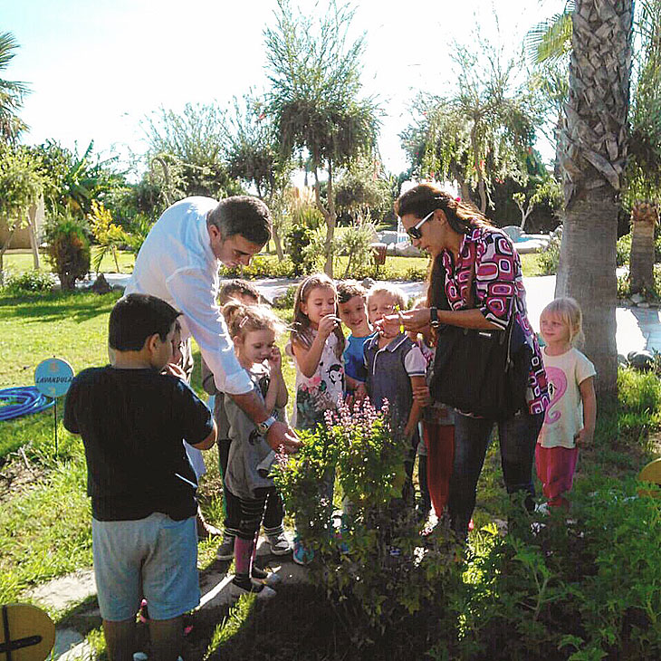 Следует отметить, что своим постоянным гостям Atrium Palace полюбился не только благодаря заботливому обслуживанию и роскошному оформлению, но и за счет разбитых по всей территории отеля многочисленных садов, изобилующих растениями, цветами и деревьями. Именно для знакомства с «зеленым уголком» отеля сюда и были приглашены школьники.