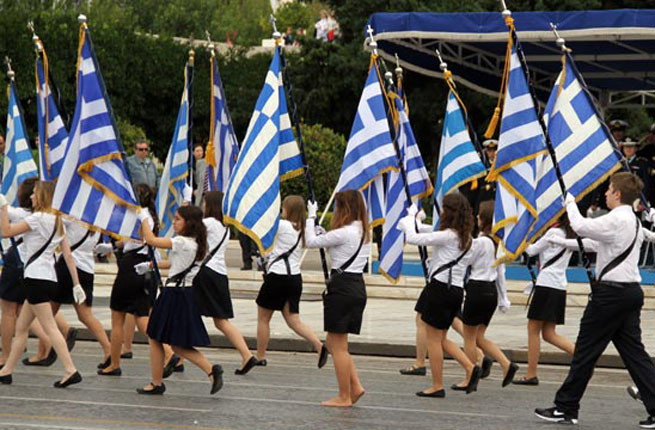 Если на школьном параде в прошлом году в Ларисе один из марширующих старших школьников, проходя перед трибунами официальных гостей, поднял в их адрес ладонь с растопыренными пальцами, что по-гречески является презрительным и оскорбительным жестом, на параде 28 октября, одна из знаменосцев-школьниц промаршировала перед парламентом... босиком, протестуя, таким образом, против политики правительства.