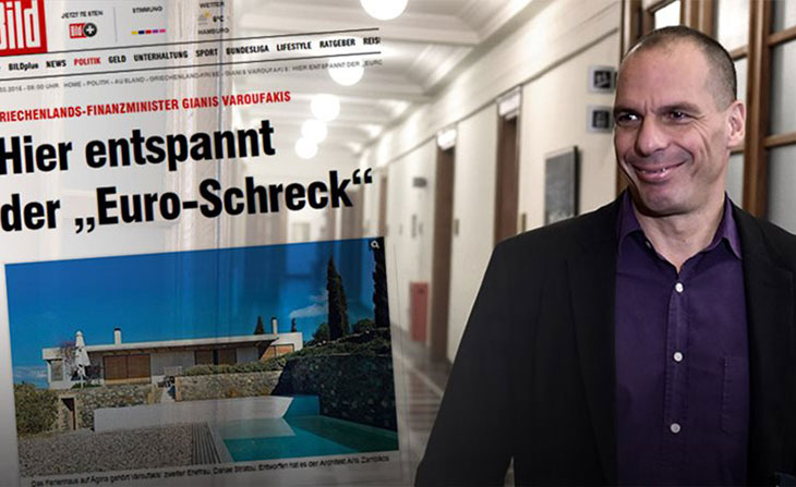 «Здесь расслабляется Евро-ужас» - заголовок немецкой газеты Bild, с фотографией загородного дома, в котором отдыхает министр финансов Греции Янис Варуфакис.