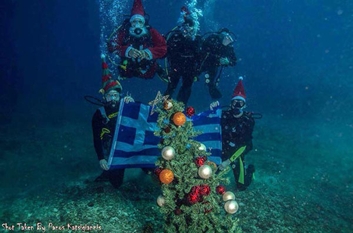 С наряженной ёлкой, на глубине 10 метров ниже уровня моря, приветствует приближающиеся праздники команда дайвинг-школы.