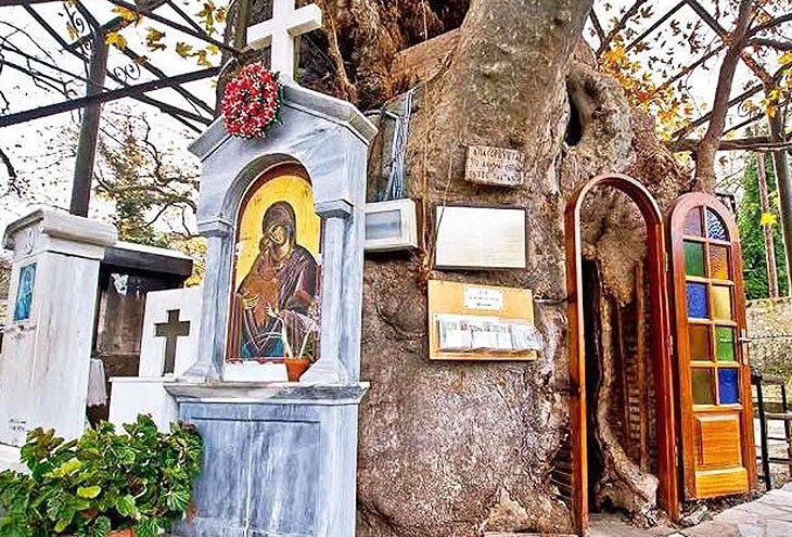 В деревне Платаниотисса, в 30 км к северо-западу от Калавриты, в красивом зеленом месте, находится одно из самых священных и уникальных мест паломничества Греции, Панагия Платаниотисса (Пресвятая Дева Платана), которая спрятана внутри дупла большого дерева.