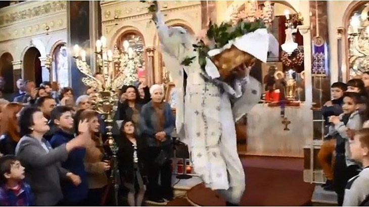 Что же до необычностей, то самая взрывная новость недели пришла с острова Хиос. Как оказалось, в местном храме Панагия Евангелистрия проповедует «летучий» священник. Отец Христофорос Гурлис получил подобное прозвище за необычный подход к проведению литургии – в процессе службы он щедро осыпает прихожан лавровыми листьями, при этом ударяясь в бег и то и дело подпрыгивая. Несмотря на то, что видео, на котором запечатлен «полет» священника, было загружено на YouTube всего пару дней назад, оно уже успело стать сенсацией.