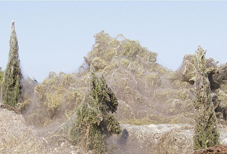 Из необычных новостей недели особо выделяется экстраординарный инцидент в районе озера Вистонида. Где-то месяц назад мы сообщали о том, что полчища пауков буквально за один вечер покрыли сплошным слоем паутины 300-метровый пляж города Этолико. На этот раз все еще серьезнее – под паутиной оказалась территория более километра, причем членистоногие умудрились покрыть своим белоснежным покрывалом даже купола церквушек и кроны деревьев.
