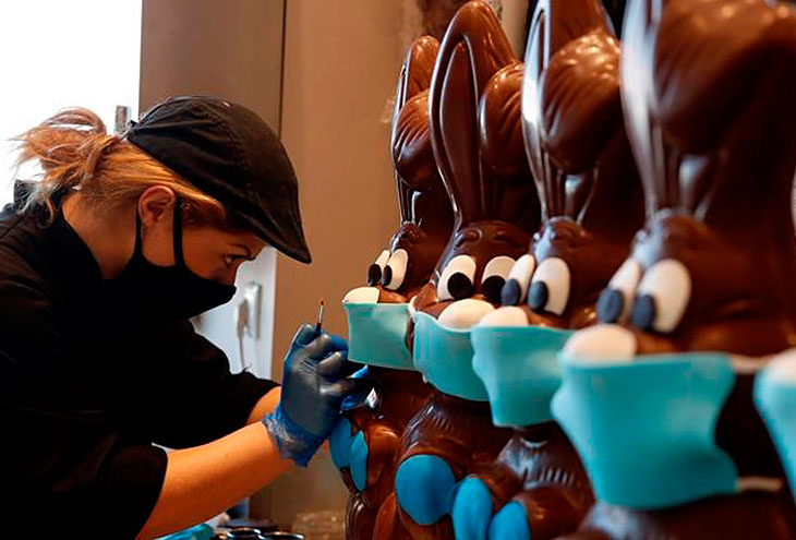 Цель создателей в подобном украшении шоколадных кроликов помадными масками состоит в том, чтобы просто пошутить и немного поднять настроение общества в такое трудное время.