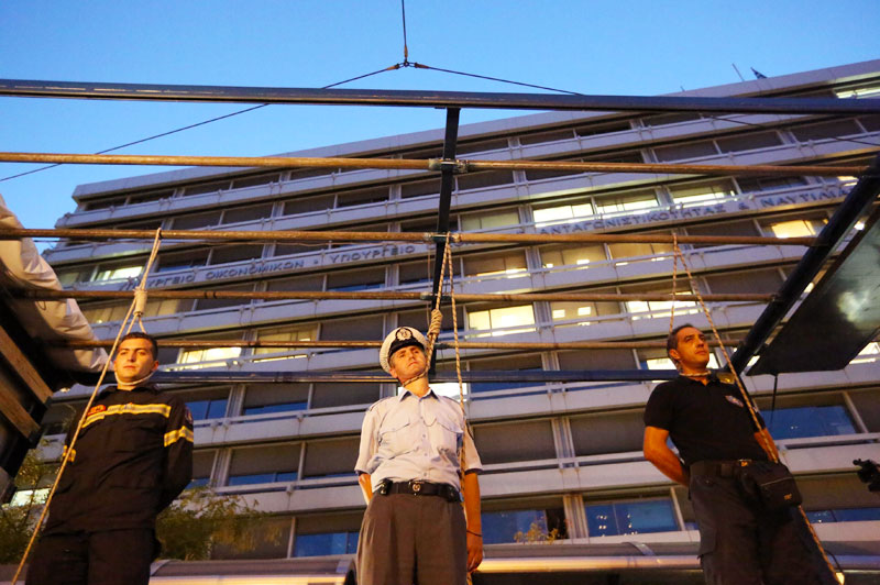 Заглавие статьи – «Крамер против Крамера» - мы позаимствовали у одной из центральных греческих газет: так точно оно выражало дух вчерашних событий, развернувшихся в столице Греции, во время забастовки работников полиции, пожарной службы и службы порта, протестующих против (дальнейшего) урезания заработной платы. Особенно красноречивой была картина, представляющая трех представителей вышеназванных служб на помосте с виселицами перед министерством финансов - молодых людей, стоящих под уготовленными им крепкими петлями.