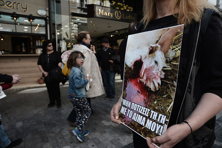 Одетая во все черное, группа веганов прошествовала по центру Афин, держа в руках плакаты с изображением убитых ягнят и коз, призывая афинян отказаться от традиционного лакомства во время празднования Пасхи 2017.