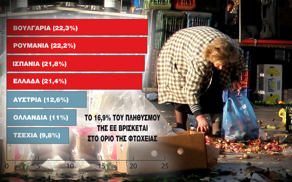 16,9% населения Европы живет на пороге нищеты: 22,3% болгар, 22,2% румын, 21,8% испанцев и 21,4% греков Самыми благополучными в Европе являются чехи (9,8%), голландцы (11%) и австрийцы (12,6%).