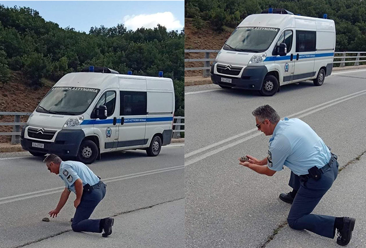 Полицейский из города Козани стал поневоле одним из самых обсуждаемых лиц греческого интернета после того, как спас от неминуемой гибели маленькую черепашку.