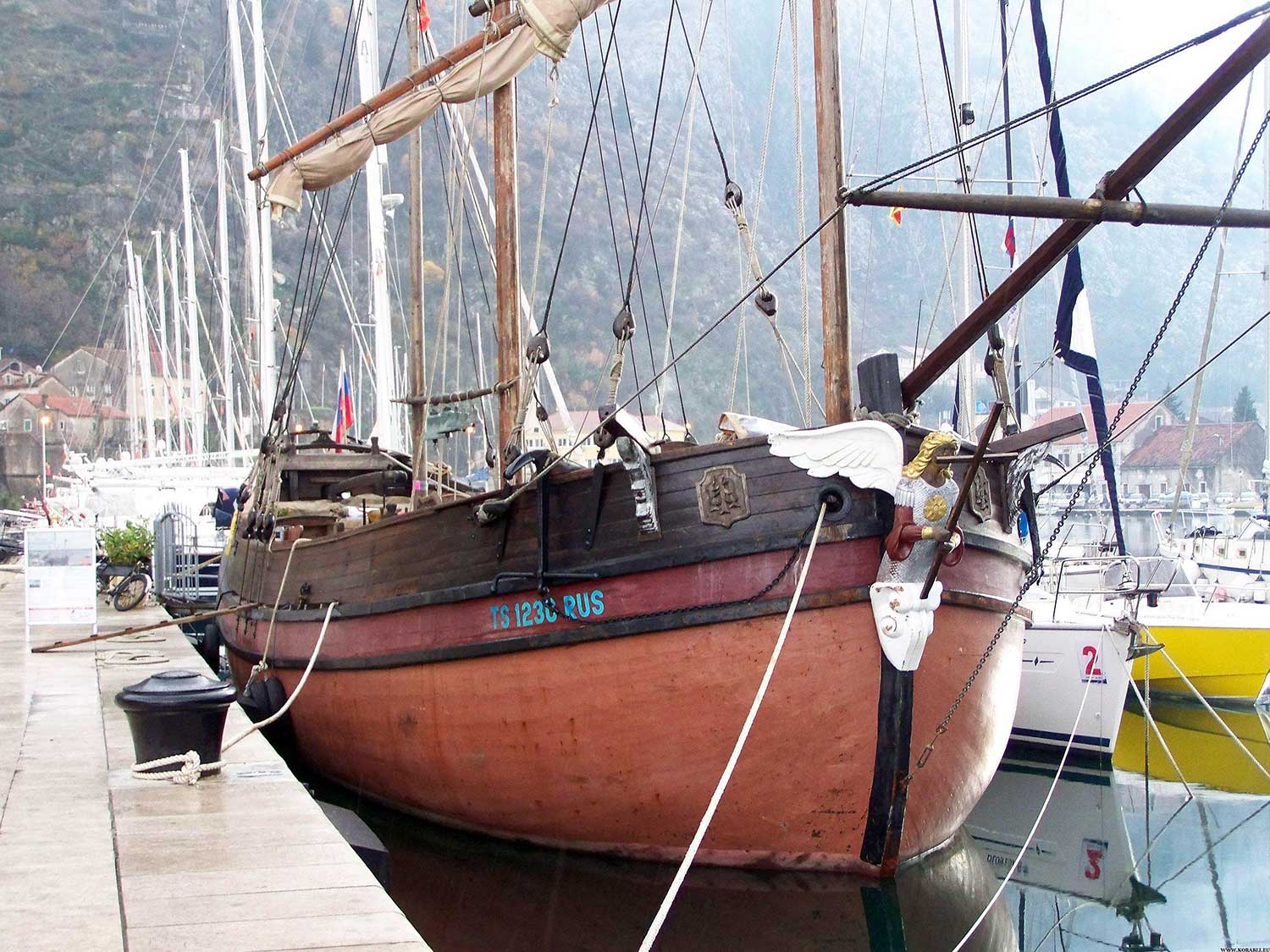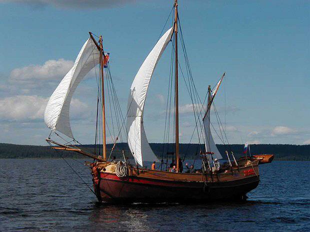 Это историческая реконструкция ладьи, которые строились на Руси с 17 по начало 20 веков. Все десять лет он ходит по морям, участвует в различных историко-культурных мероприятиях, вывозит в море кадетов из детских морских школ. И снаружи, и изнутри корабль выглядит вполне достоверно. Притулившийся рядом с деревянным штурвалом монитор картплоттера, гидравлика руля и электрическая якорная лебёдка, совсем не бросаются в глаза. Ну и дизель конечно притаился в машинном отделении, без него сейчас никак. А вот паруса поднимаются как в старину, без помощи лебёдок и в стоячем такелаже нет винтовых талрепов и нержавейки (по крайней мере на виду). В трюмах, где по идее когда-то возили грузы, оборудованы каюты, но всё довольно по-спартански, в духе судна - простое дерево, никакой полировки и гобеленов. В кают компании подвешенный на канатах стол и дровяная печка.