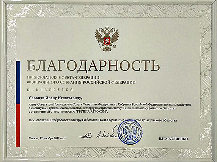 Иван Саввиди отмечен Благодарностью Советом Федерации (СФ) России «за многолетний добросовестный труд и большой вклад в развитие гражданского общества».