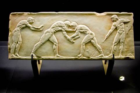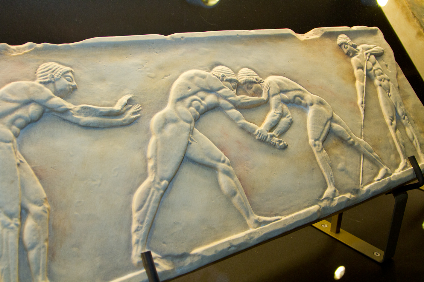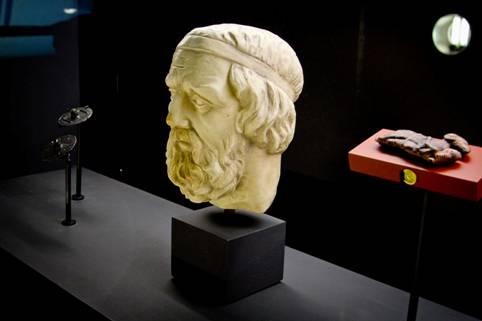 Среди них демократия, справедливость и искусство. В то же время среди экспонатов выделяются копия головы Гомера, изображения спортсменов, статуэтка боксера и театральные маски.