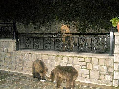 Сайт epirusgate.blogspot.gr опубликовал фотографии, которые прислала читательница Димитра Пафи, заснявшая их на заднем дворе. Предполагается, что медвежата остались без надзора их матери, которая, вероятно, погибла. Малыши кажутся знакомыми с людьми, и их визиты увеличились с середины августа. Однако в этой ситуации есть повод для беспокойства: как и где медвежата проведут зиму, ведь медведи в холодный период впадают в спячку. Кроме того, есть риск, что некоторые жители отнесутся к непрошенным гостям недоброжелательно, поскольку нельзя чувствовать себя в безопасности, когда медвежата подрастут.
