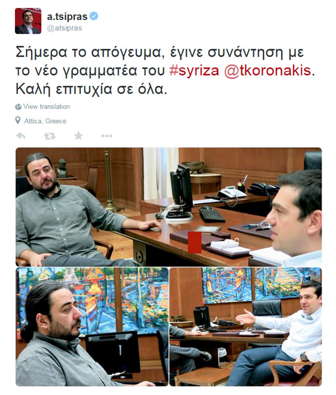 «Во второй половине дня состоялась встреча с новым секретарем #syrizatkoronakis. Удачи всем !», - пишет Ципрас.