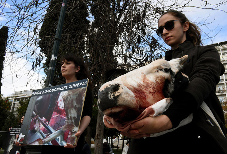 Противники употребления в пищу продуктов животного происхождения вышли на улицы Афин с коровьими головами в руках.