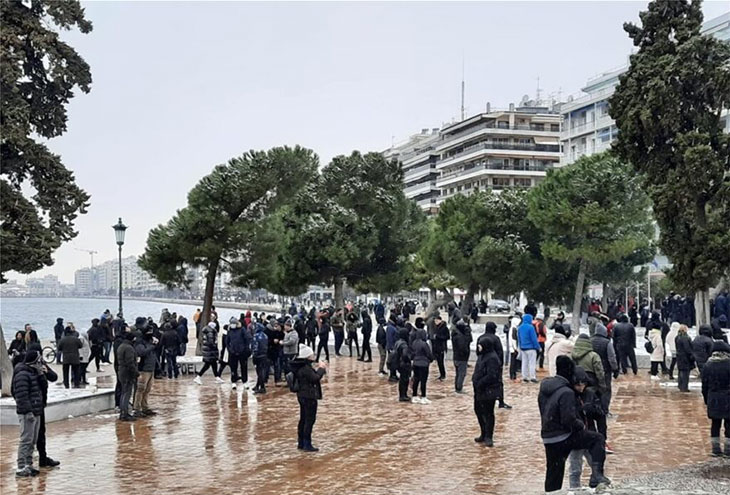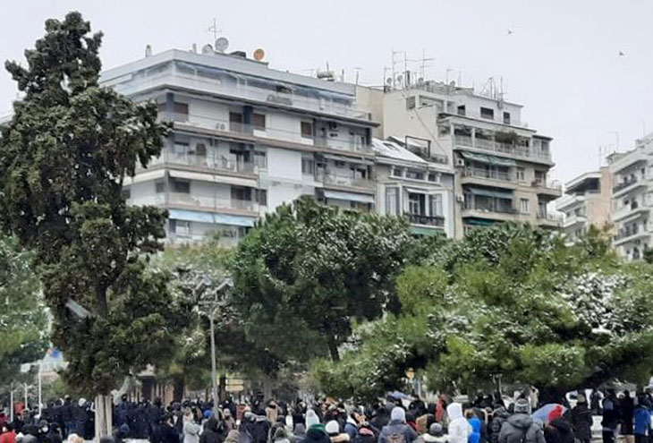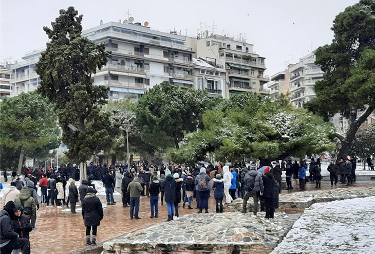 Недовольные продолжительным локдауном протестующие собрались у городской достопримечательности, «Белой башни», несмотря на нетипичные низкие температуры и снегопад, чтобы выразить свое возмущение изоляцией.