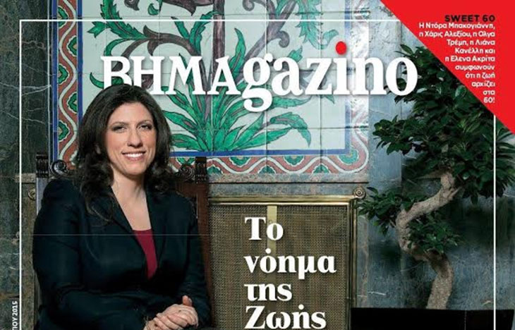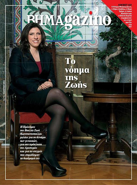 Под названием «Смысл Зои» (здесь игра слов – «Зои» по-гречески значит «жизнь» – ред.) будет выпущен ΒΗΜΑgazino, воскресный журнал газеты ΒΗΜΑ. Название относится к председателю Парламента Греции Зои Констандопулу, которая давала интервью и позировала перед объективом.
