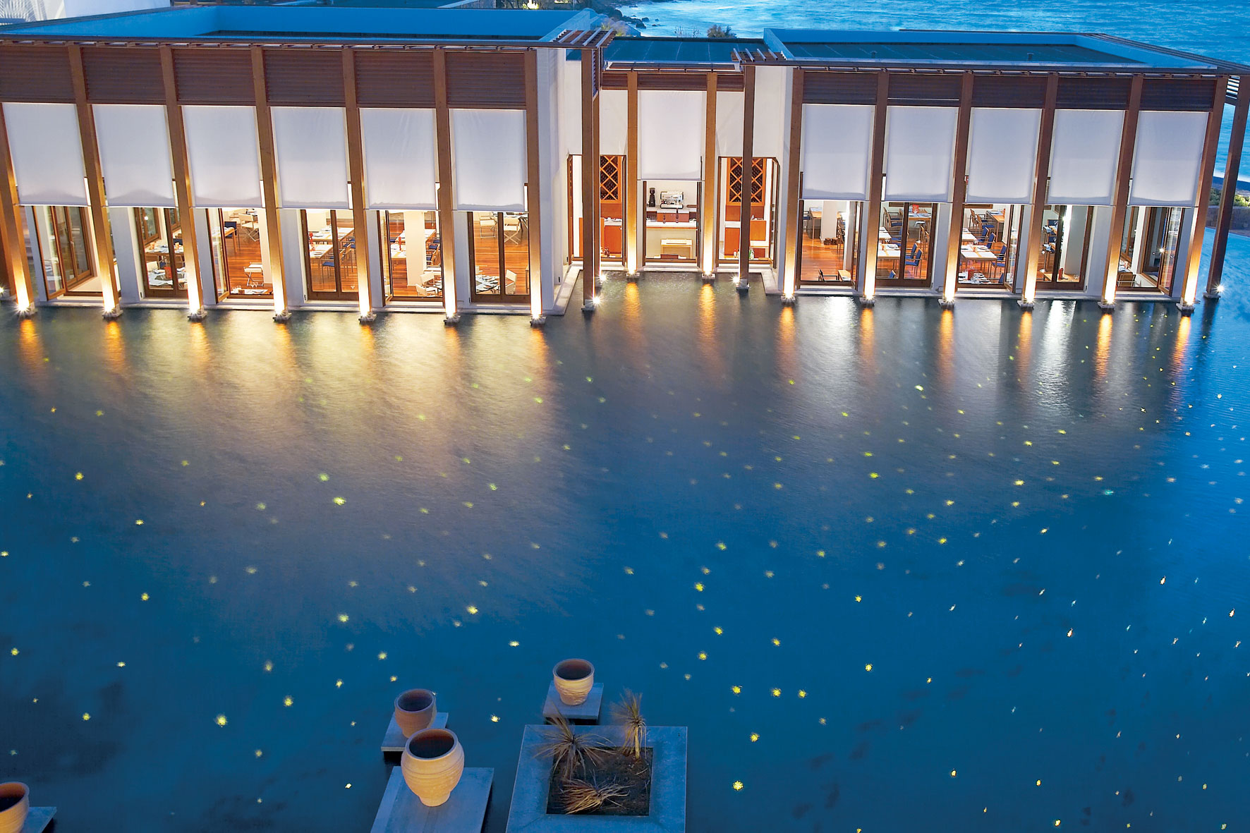 С закатом в Amirandes приходит час мистерий и визуальных эффектов: оживают фонтаны, загораются факелы, подсвечивая колонны и стены из камня. В такие минуты